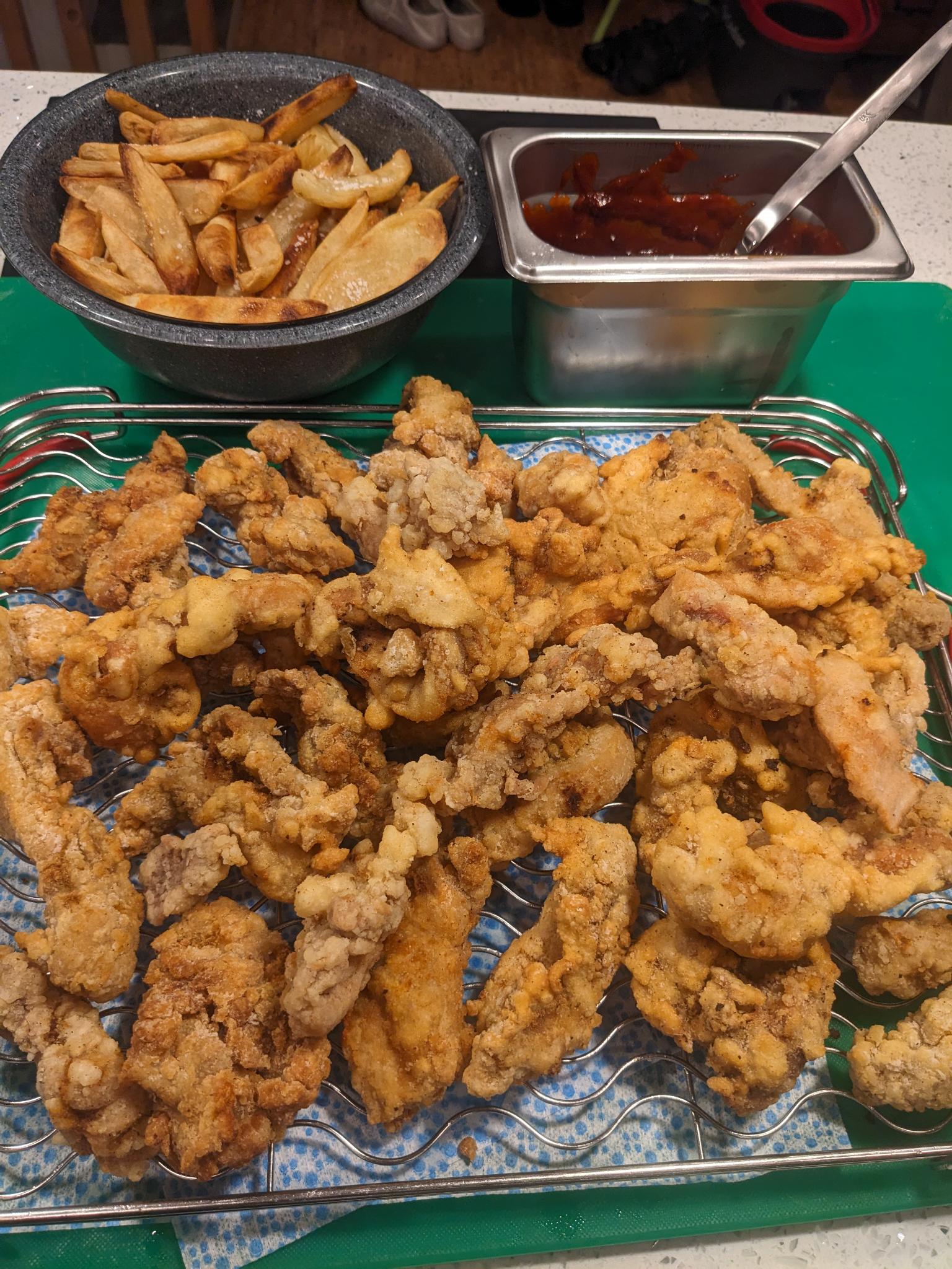 - Batter/dredge each piece as you go - don’t let it sit around battered.